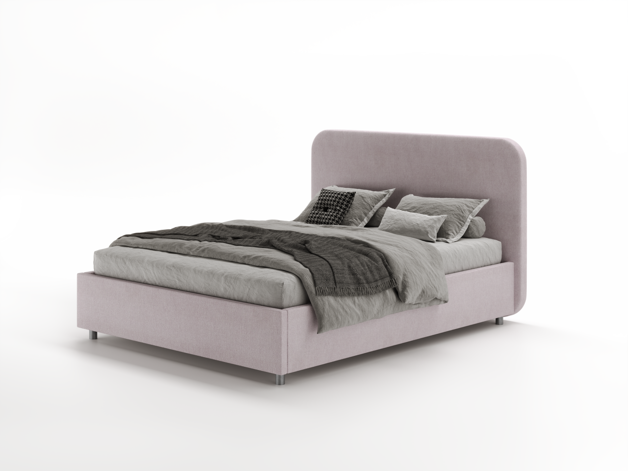Царга здесь гармонично поддерживается скругленным контуром изголовья, а отсутствие стежки и простота форм позволяют создать единый законченный образ кровати.